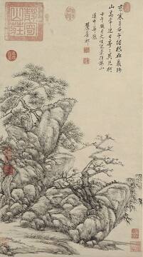 Wang Yuanqi embraced the principles of painting promoted by Dong Qichang (see his paintings on this wall) and further developed his analytic style. Like Dong, Wang plays with forms by breaking up the landscape structure into discrete units. Here, he cleverly shrinks the trees and piles of rocks into a bonsai-like scene, creating deliberate confusion as to whether a real or miniature landscape is intended.