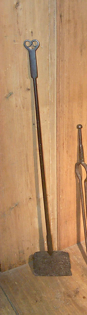 DescriptionSmall, flat long-handled shovel with two rings in handle end.