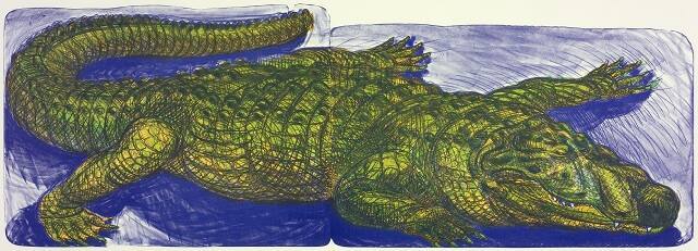 DescriptionLong-snouted beast with plated hide, facing right, tail coiled to top and right, right rear leg retracted, right front leg bent, both left legs, top, spread. Bluish-grey dround, dark blue shadows, bottom. Scales of hide yellow and green, overlaid by network of dark lines.Copyright© Estate of Luis A. Jimenez, Jr. / Artists Rights Society (ARS), New York