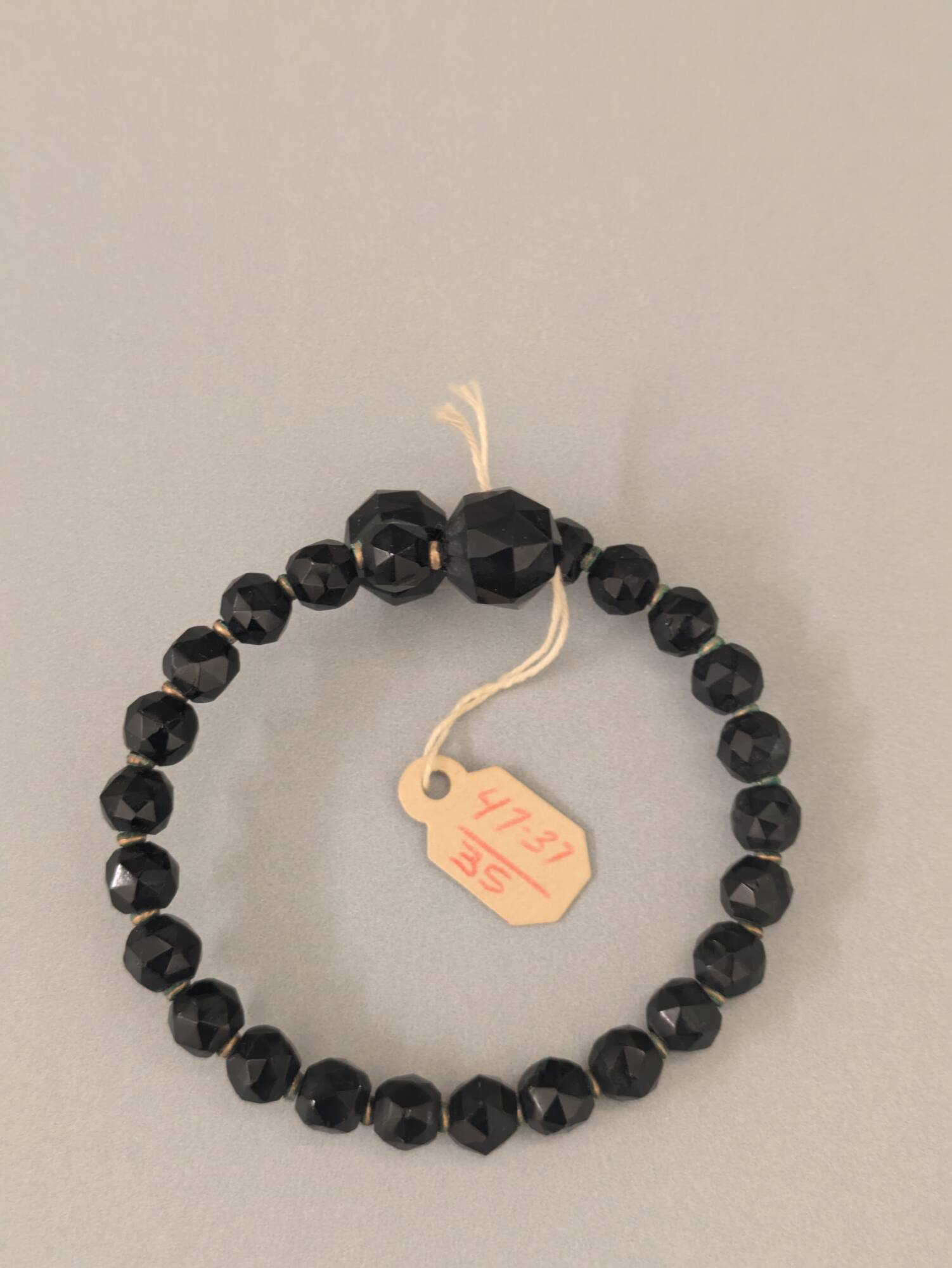 DescriptionOne of a pair of bracelets, black onyx beads on spring, separated by tiny gold rings. Large bead on each end of bracelet.