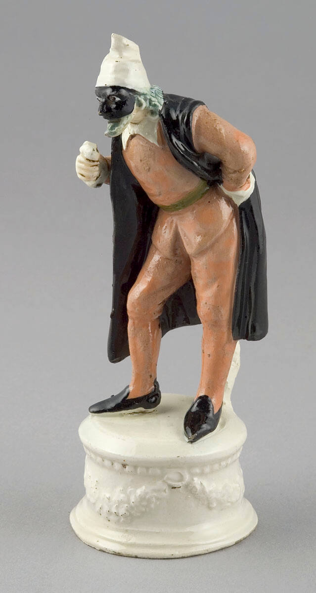 DescriptionMale figure in pose of an old man with body bent forward from waist, left hand at hip, right hand holds object, standing partically supported by tree trunk on circular white plinth with garland decoration; wears grey-white peaked hat, black mask, white collar, black sleeveless cloak over brown suit, black belt, black slippers; blue crown on bottom.