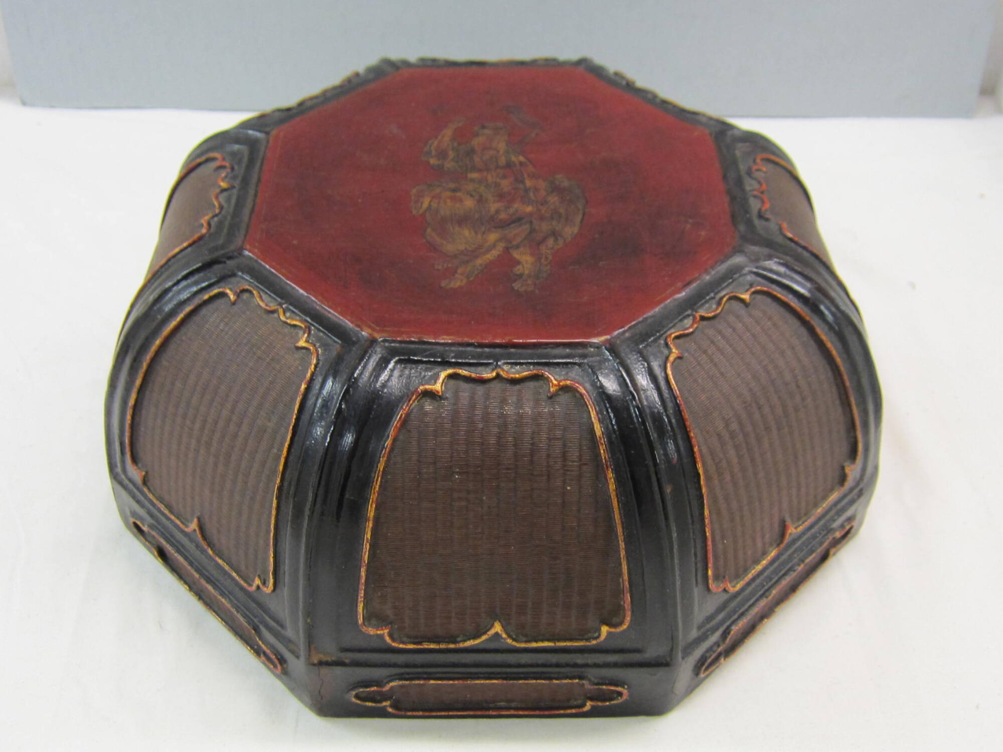 DescriptionBlack lacquer; exterior with wickerwork panels, framed in gold; interior in red lacquer with decor of figure carrying fly whisk, riding on fu lion; inscription on bottom.