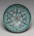 The decoration of this vessel demonstrates the pervasiveness of early Islamic designs in the eastern Islamic lands. The inside of the bowl is painted with interlocking palmettes and split-leaf arabesques that create a repeating hexagonal pattern radiating from the center. Turquoise glaze is frequently used in Islamic art at this time in the production of ceramic wares and glazed architectural tiles.