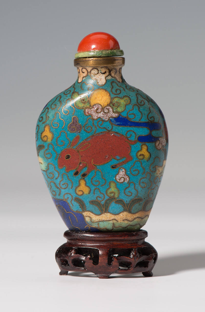 DescriptionDecorated on each face with a rabbit, one in red and the other in aubergine, encircled by gourds above rocks and plants, all on a turquoise ground.