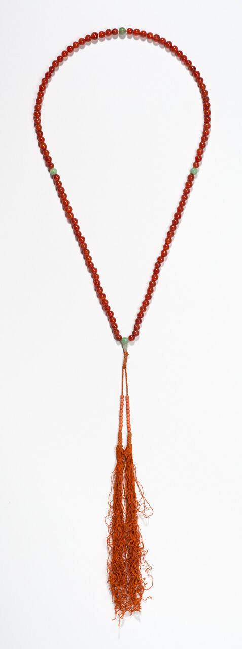 DescriptionSmall round carnelian beads with four green jade beads. Long orange silk tassel. Worn by Buddhist priests.