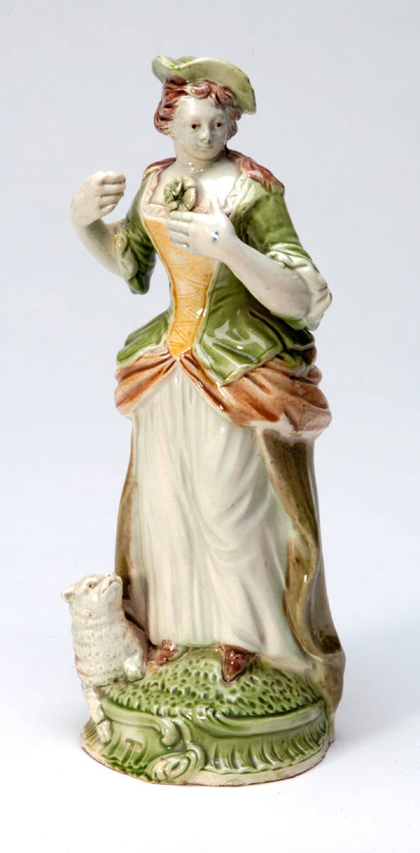 DescriptionEach figure holds a crook and stands on a circular, shell-molded, green base. Shepherd wears black hat, white shirt, green coat, light brown cloak, olive-colored breeches, leans against tree stump beside which dog looks up at him. Shepherdess wears green hat, white dress, green bodice, yellow vest, brown panniers and robe; sheep at feet.