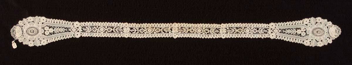 DescriptionMixed needle and bobbin lace (part-lace technique) known as Duchesse de Bruxelles. Mostly bobbin-made whole and half stitch with thick outlining threads. Some linking bars. Inset motifs of needle lace of the point de gaze type, including three-dimensional applied petals. Straight center section swelling to pointed ovals at either end. The end pieces each contains a central flower-medallion with a needl-made center and, below it, a naturalistic needle-made flower head. Bobbin-made leaves and flower heads fill the remaining space and extend in a more [illeg.] and stylized form through the central band.