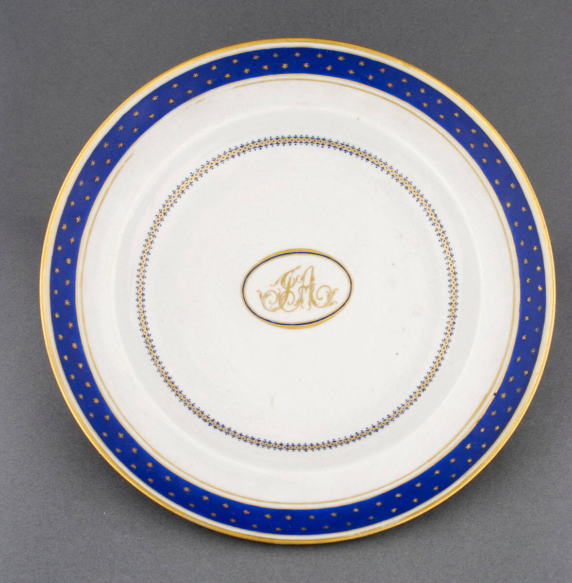 DescriptionShallow bowl with monogram J.A. Blue vorder with gold stars.