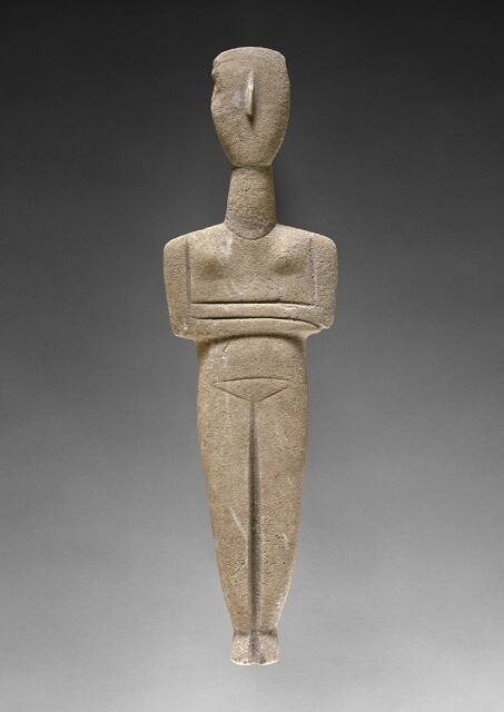 The figure’s highly abstract appearance contrasts with that of the nearly contemporaneous Egyptian sculptures.