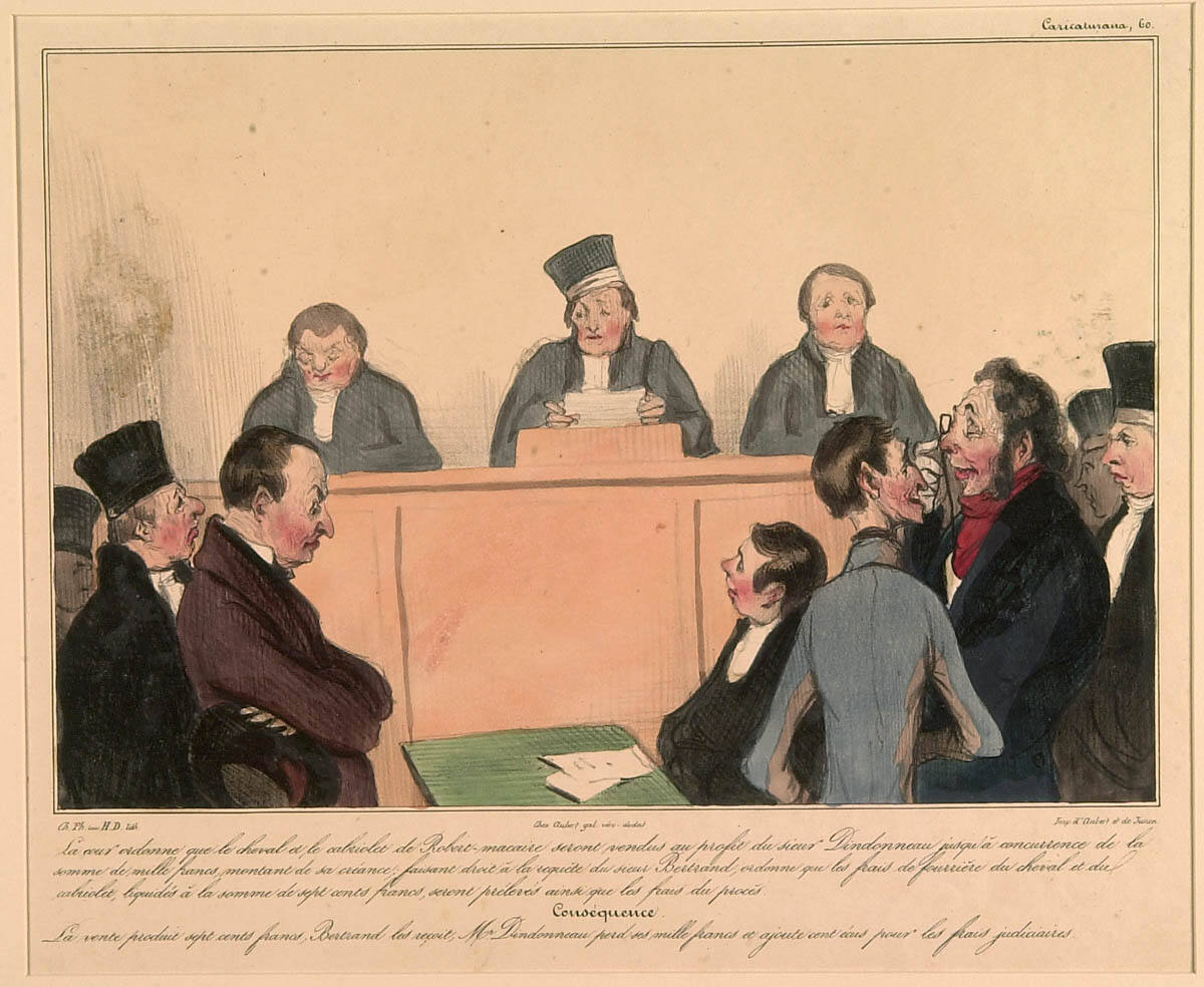 George L. McKenna, Prints, 1460-1995 (Kansas City, MO: Nelson-Atkins Museum of Art, 1996), 295-96, as Caricaturana (Les Cent Robert Macaire): Untitled (The court orders that the horse and cabriolet ... be sold... ).