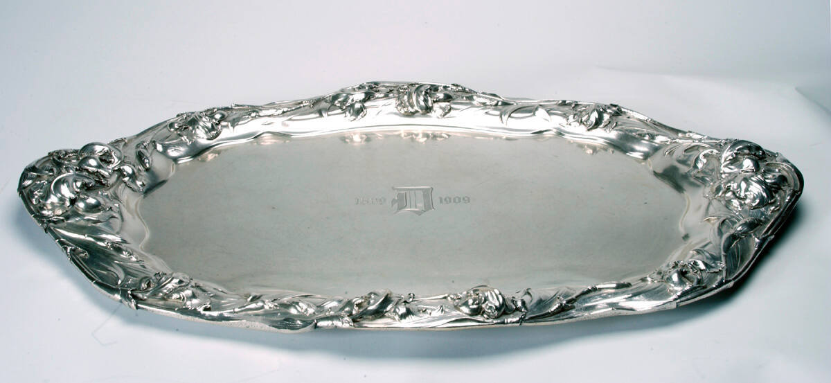DescriptionMarks on bottom: eagle, R, lion/ STERLING/ 125/ A. Oblong tray with raised undulating border of repousse design depicting irises and long, slender leaves.