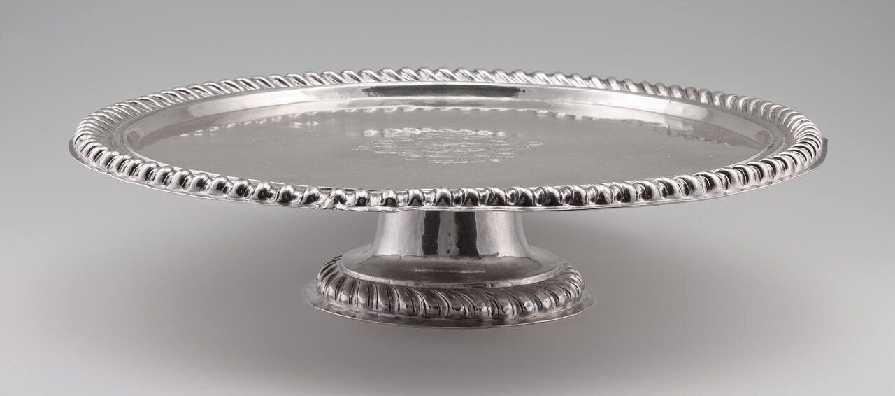 DescriptionLow footed flat salver with spiral gadrooning around rim and foot. Coat of arms in center.
