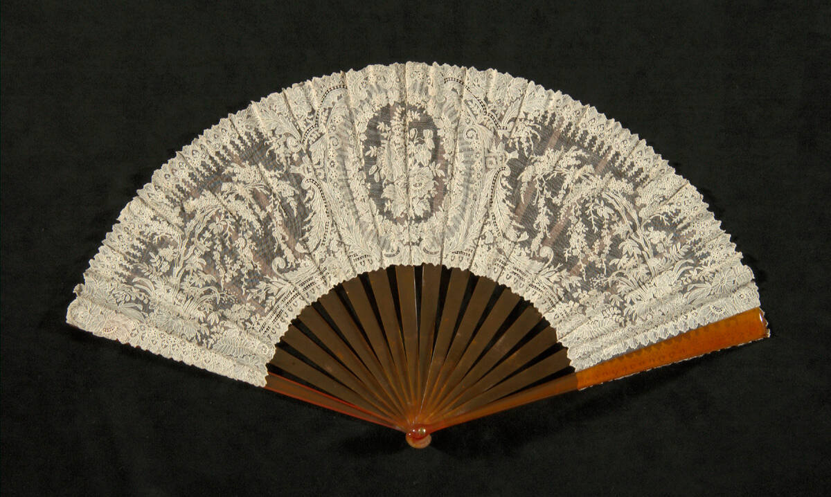DescriptionFan with amber sticks mounted with Brussels lace, center medallion of flowers, ends of reeds and flowers.