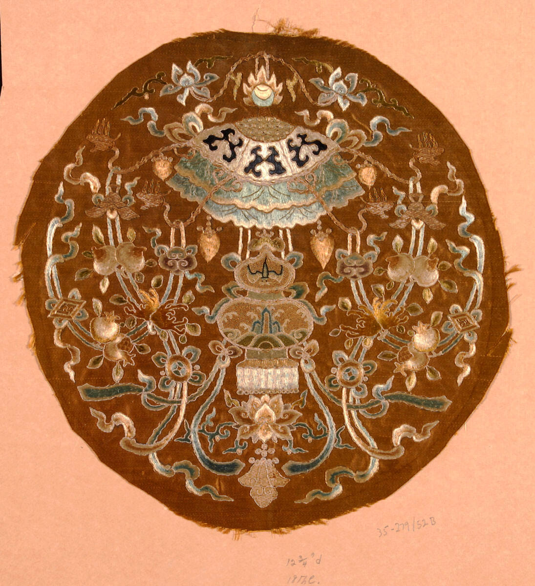 DescriptionCircular medallion from a lady's coat. Gold colored satin embroidered in satin and Peking stitch and couched gold thread. Design of lantern, flowers and fruit. From tomb.