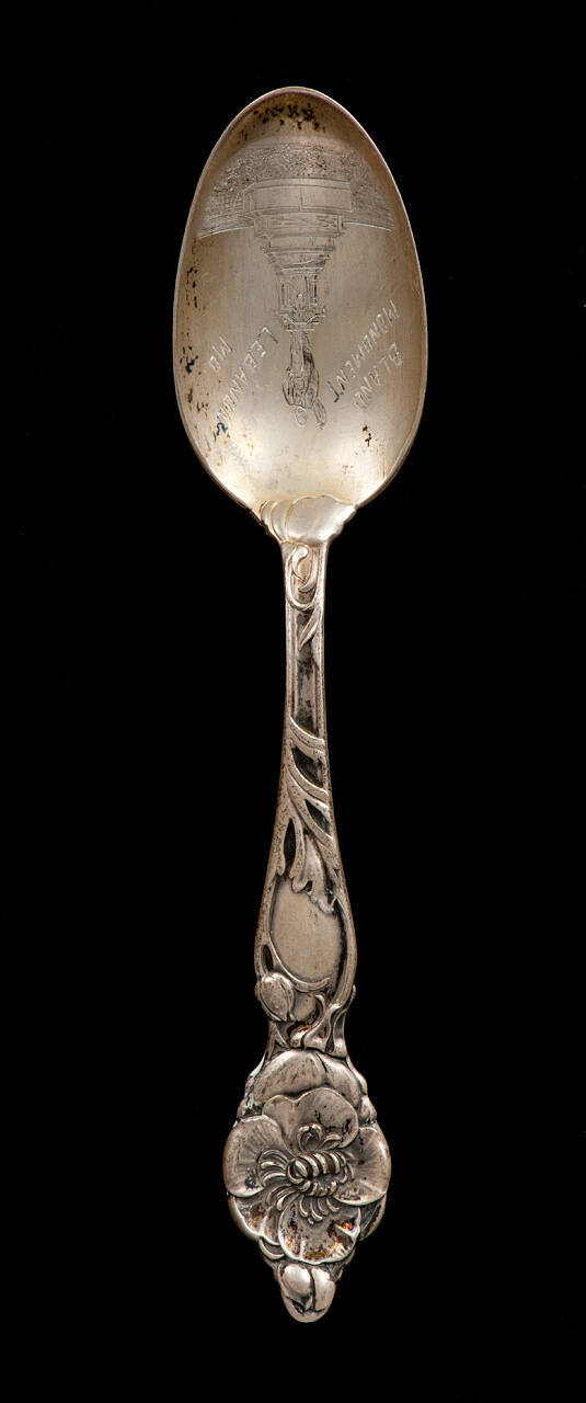 DescriptionFloral and foliate design in low relief on handle. Bowl engraved with view of monument and inscribed "Bland Monument Lebanon, Mo."