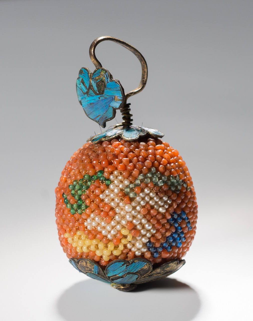 DescriptionRound earring covered with small beads, orange bead background with designs in black, green, white, blue, and yellow beads.ProvenanceElla Anna Loose (née Clark, 1860-1945), Kansas City, MO, and Washington, DC, by 1934 [1];