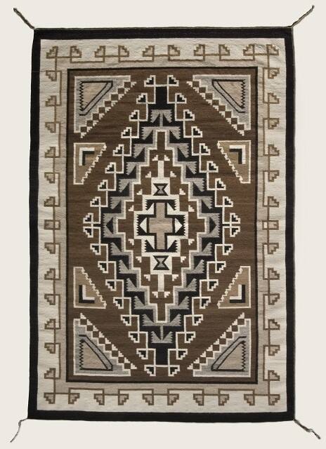 DescriptionHas two blue prize ribbons attached to corner.Gallery LabelDaisy Tauglechee is regarded by many as the greatest Navajo weaver of the last century. She was known for her ability to create exceptionally fine, beautifully orchestrated weavings and for her prominent role in developing the Two Gray Hills style. The type, which emerged in the 1920s as one of the regional reservation styles, is characterized by undyed wool-white, black, grays and browns; intricate, precisely rendered geometric designs, often with a central diamond motif; and extremely fine weave. Indeed, Tauglechee's weavings often contain approximately 115 weft stitches per inch as compared to the conventional standard of 35. In this classic work, Tauglechee skillfully combined the neutral colors of the natural wool with a complex composition of interlocking geometric shapes. The result is an overall sensation of energy, balance and harmony, the essence of Navajo aesthetics.