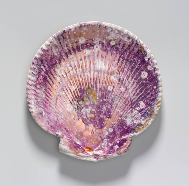 Gallery LabelPart of a 22-piece dessert service, this bowl and the two shell-shaped plates are glazed with moonlight lustre, a process developed by Wedgwood between 1805 and 1815. This method uses gold metallic salts which turn varying colors when fired depending on the color of the ceramic ground. Here, the white clay body produced a mottled surface of pinks, purples and golden yellows.