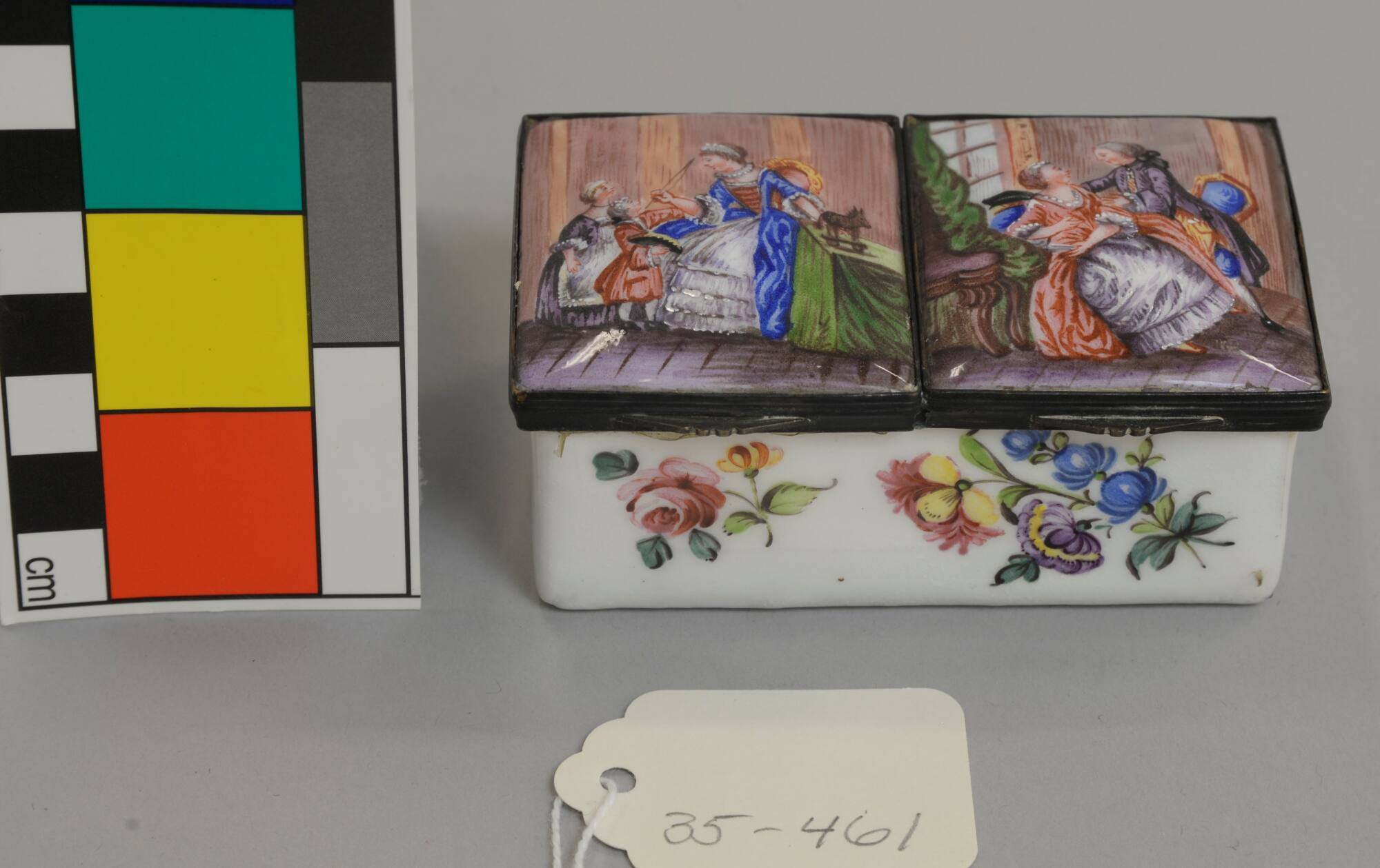 DescriptionRectangular white porcelain box with divided hinged lid with brass mount. Enameled on top with two 18th C. scenes. (1) Woman and two children. (2) Man and woman at window. Decorated on the sides with enameled flower designs.ProvenanceMargaret Cameron Chapman (née Mann, 1865-1935), Kansas City, MO, by 1935;