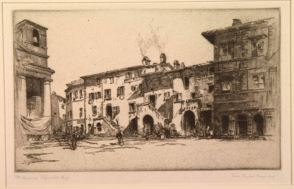 Gallery LabelThe American etcher John Taylor Arms specialized in European subjects, mostly of England and France. He made numerous architectural prints similar to David Young Cameron’s St. Etienne. This early print was made a year after the end of the Great War, in which Italy eventually triumphed over Austria-Hungary. The exhaustion of the period after World War I can perhaps be sensed in this quiet piazza.