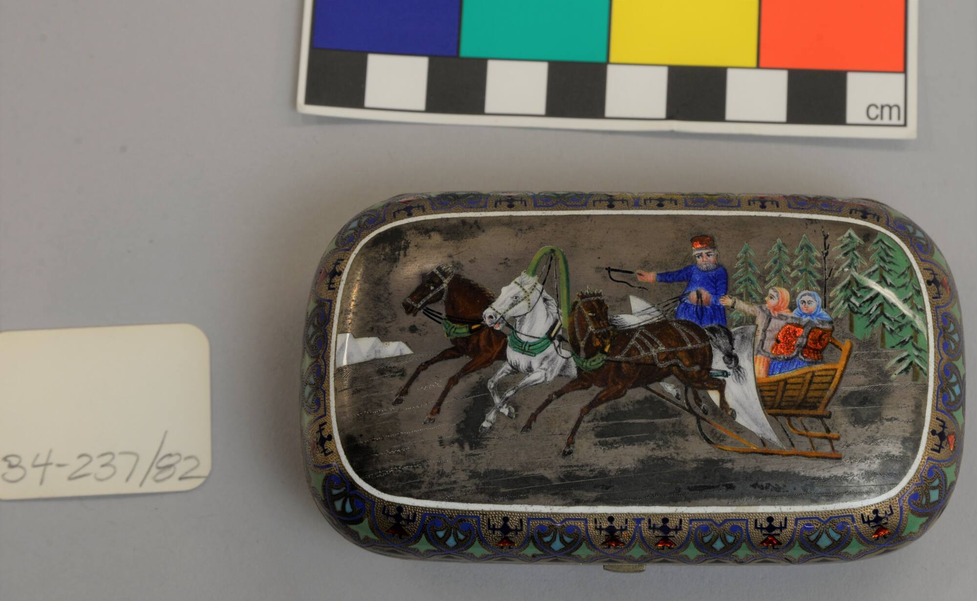 DescriptionRectangular-shaped cigarette box with rounded corners and sides. Top: a design in painted enamel of two women and a man in a sleigh drawn by three horses. Bottom: Formal design in painted enamel.ProvenanceElla Anna Loose (née Clark, 1860-1945), Kansas City, MO, and Washington, DC, by 1934 [1];