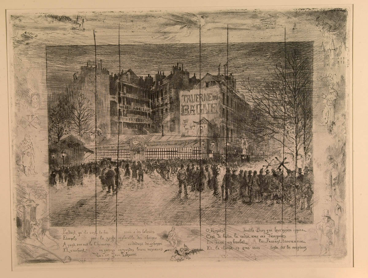 Gustave Bourcard and James Goodfriend, Félix Buhot, catalogue descriptif de son oeuvre gravé (New York: M. Gordon, 1979), no. 163, p. 105, as La Place des Martyrs et la Taverne du Bagne. Possibly Architecture and Decorative Arts in Prints from the Permanent Collection, The Nelson-Atkins Museum of Art, Kansas City, MO, March 13-April 10, 1983, p. 5, as La Place des Martyrs et Taverne du Bagne (Final state), 1885.