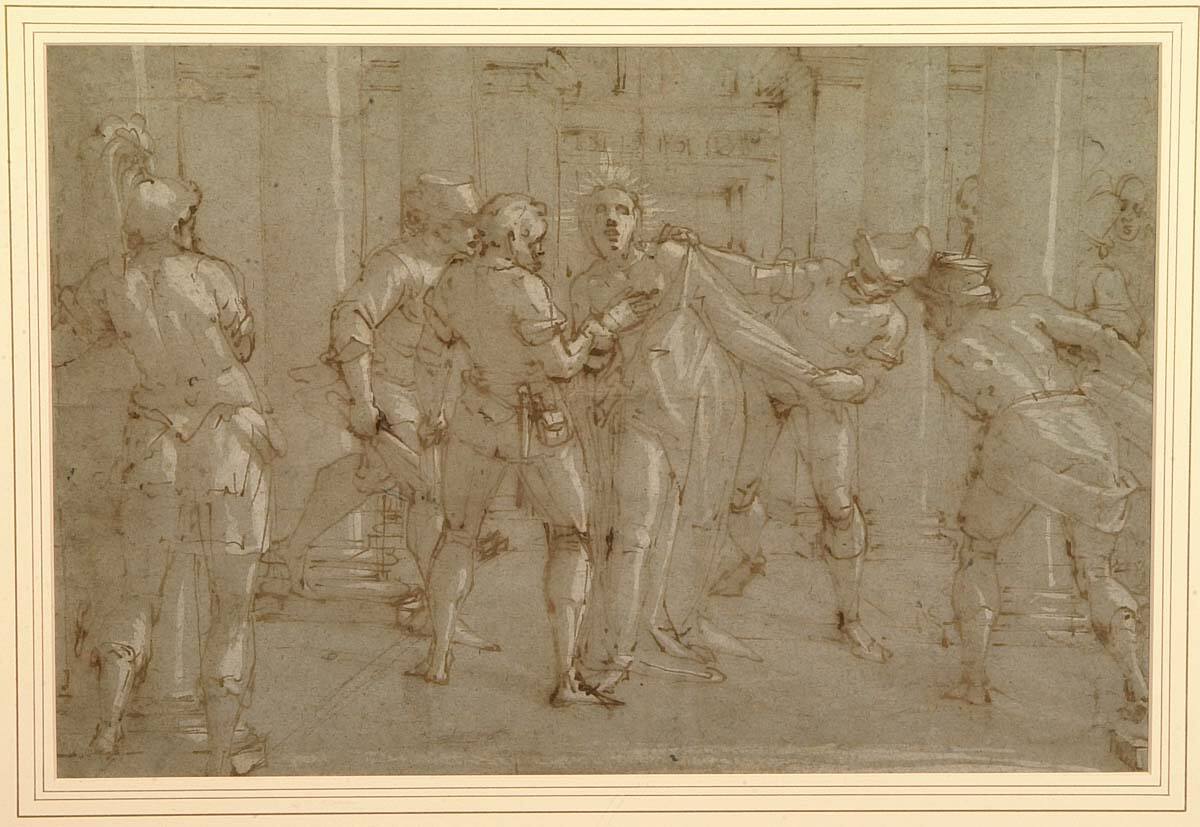 The Bible describes how Pontius Pilate, the governor of Judea, ordered his soldiers to flog Jesus before leading him to his death. Luca Cambiaso portrays this event in a palatial setting. Jesus occupies a privileged position at the center of the composition between two colonnades. These rows of columns decrease in size at regular intervals to create a convincing illusion of spatial recession. Additional details, such as Jesus’s upturned gaze, communicate his vulnerability and quiet acceptance of his fate.