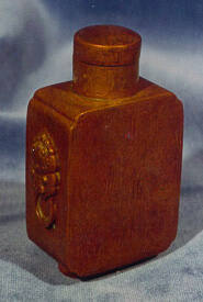DescriptionMatch-box-shaped bottle inlaid with silver dragon design on both sides, lion mask and ring handle, matching spoon and stopper.