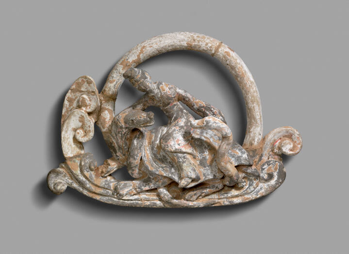 DescriptionGray clay figure, with traces of pigment and earth encrustations. Figure is of a woman on the back of a tortoise facing to the right and with a snake coming up on the figure's left side.