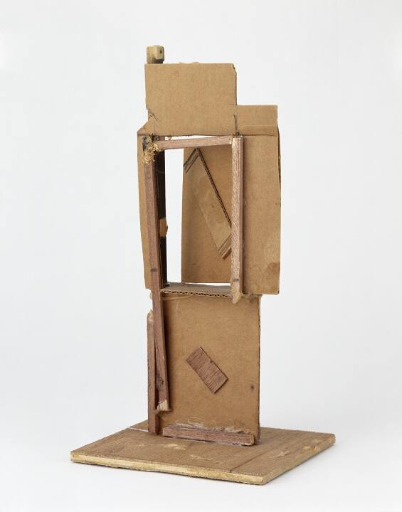 DescriptionWood base plane with attached vertical rectangular wood frame. Cardboard panels attached to frame created Dutch door with lower portion closed, upper portion partially open. Some gray and red pencil markings. Strips/chips of wood veneer and cardboard are affixed at 45 degree angles to door panels.Copyright© Estate of Siah Armajani / Artists Rights Society (ARS), New York