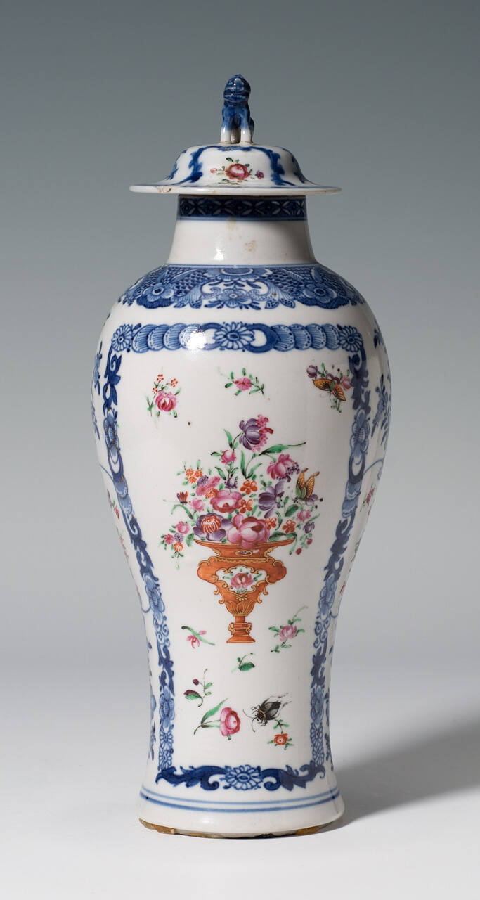 DescriptionBaluster shape with large rectangular borders of blue flowers and leaves on opposite sides; within borders are representations of a vase with flowers and other freely distributed flowers and insects, all in burnt orange, pink, lavender and green. Other borders and flowers in the same colors follow contours of vase. Smallest vase has slight variations in flower configurations and has slightly darker blues. Bell shaped lids with Foo dog on top of each.