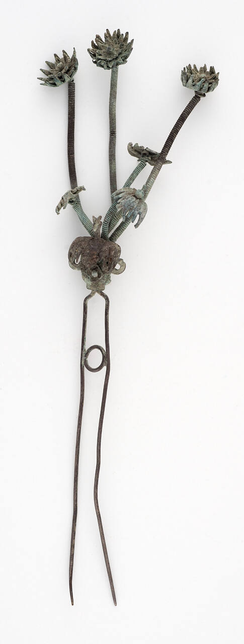 DescriptionTiny flowers and leaves on stems of coiled wire, all of bronze with rich green patina.