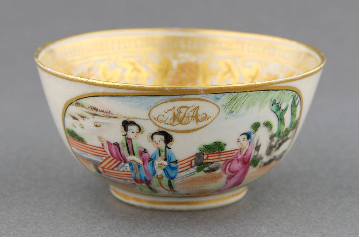 DescriptionPart of 77 piece tea service. In bottom of saucer, on exterior sides of cups is a scene painted in famille-rose style stowing 2 Chinese ladies and attendant in garden. Above figures is gold monogram, MTA (?) in gold oval. On interior sides of all pieces is border design in gold of grape bunches and leaves. On handleless cup on exterior side is also a gold spray of leaves and berries.