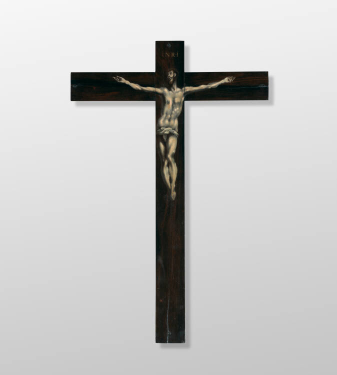 This small Crucifixion is painted directly onto three pieces of ebony made up to form a cross. Although the elongated proportions of Christ’s figure are typical of El Greco, there is a dryness in the handling that suggests the hand of an assistant. Small Crucifixes like this were portable and therefore suited for private devotion or travel. The painted images could also serve as models from which customers could select paintings on a larger scale.