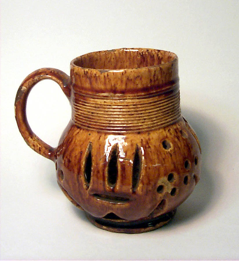 DescriptionDouble-walled mug of oblate globular form with cylindrical, reeded neck and "ling lung" decoration; covered with light and dark brown glazes. Loop handle.