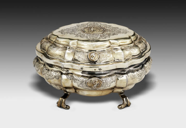 DescriptionOval box on scroll feet. Engraved designs and repousse medallions.Gallery LabelThe aristocracy of 18th-century Europe favored an opulent lifestyle enriched with decorative wares in a variety of luxurious materials, including gold, silver and porcelain. Inspired by exoticism, the Meissen Pagod with a parrot perched on her arm is a European interpretation of a female version of the Asian god of happiness. Not simply decorative, the pagod's open mouth allowed incense aromas to escape from her hollow form. Bringing refinement to the table and, like the pagod and Boy Masquerading as a Sultan, reflecting the European fascination with foreign cultures, the Meissen Cream Pot is ornately decorated with gilded, exotic scenes including palm trees and monkeys. The gilded Sugar Box, produced in Augsburg, an 18th-century goldsmithing center, may have been part of a fashionable, elaborate traveling service.