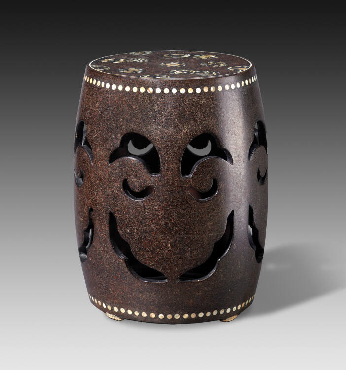 DescriptionBlack lacquer barrel shaped stool, inlayed with mother-of-pearl designs of birds, flowers, and trees.Exhibition HistoryThe Art of the Forbidden City, Minneapolis Institute of Arts, November 30, 1954-February 28, 1955.