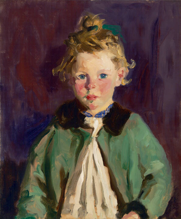 DescriptionAgainst variegated reddish-purple ground, half-length, frontal portrait of rosy-cheeked, blue-eyed little girl with tousled brown hair, green ribbon, wearing open green coat with brown fur collar and cuffs, blue plaid dress collar beneath coat, white scarf, center.Gallery LabelCozad, Nebraska, native Robert Henri was one of the most charismatic and influential art teachers in early 20th-century America. His many students included George Bellows, William Glackens and John Sloan as well as Edward Hopper and Stuart Davis.