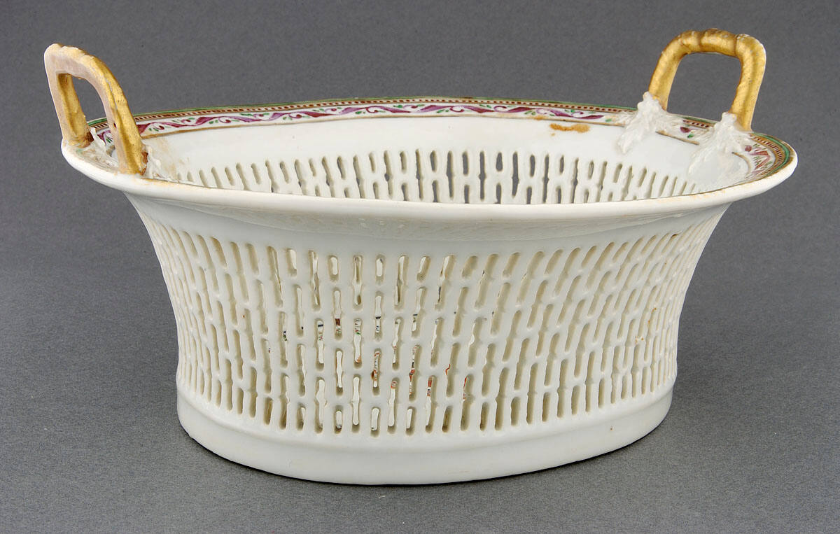 DescriptionOval serving basket with pirced sides, two handles and with Grierson arms, "Hoc Securior". Floral borders with purple, gold and green.
