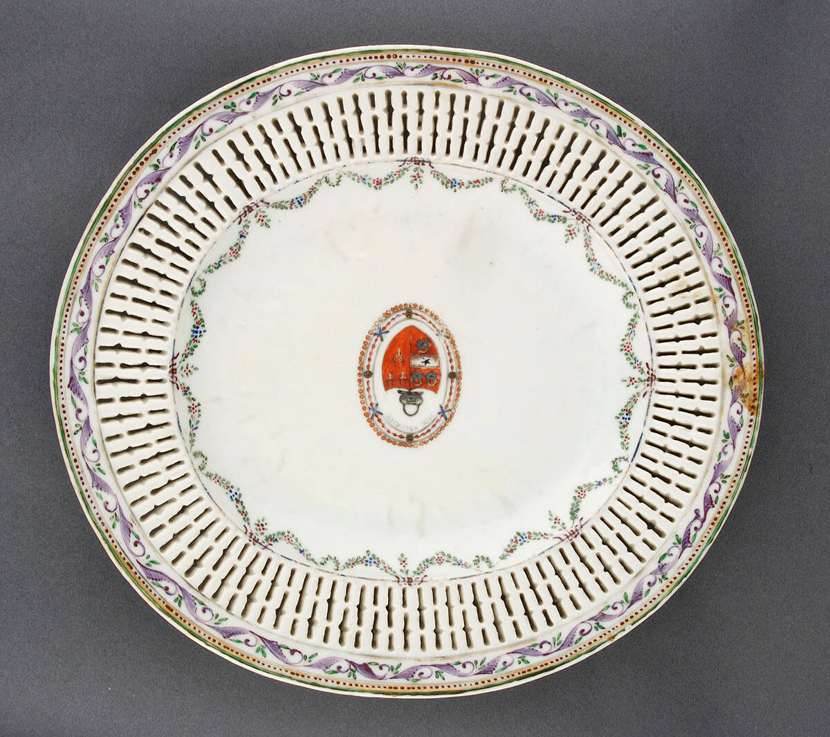 DescriptionTray with Grierson arms, "Hoc Securior". Floral borders with purple, gold and green.