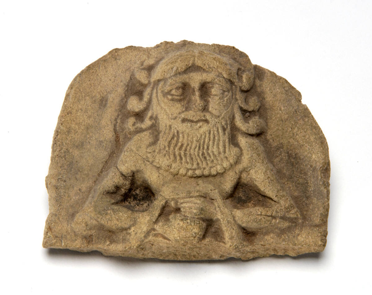 DescriptionHead of king, hands clasped in front, elaborate beard and hair, in low relief.