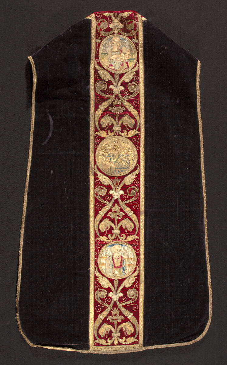 DescriptionGround fabric: solid purple silk cut velvet. Orphreys: solid red silk cut velvet with applied roundels of linen embroidered with floss silks and silver-gilt thread in lanyard-short stem and straight stitches, laid and couched work. The hands and faces are of applied tabby weave silk (backed with paper) and embroidered in straight stitches. The red velvet ground is ornamented with applied yellow, white, and mauve ribbed tabby silk with additional sefts of metal thread, and with couched silver-gilt cord.Exhibition HistoryThreads of Gold: Brocades and Embroideries for the Church, Spencer Museum of Art, University of Kansas, Lawrence, KS, July 2-September 1, 1985, no. 16.