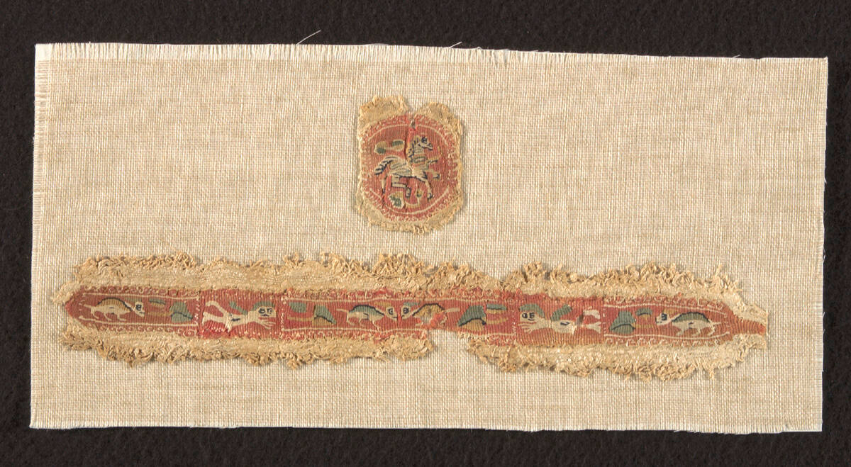 DescriptionToga front fringe decoration; in red, green, brown and black; depicting fantastic animals, winged Amore, and leaf designs
