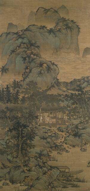 The assumed owner of this landscape painting is pictured here sitting in an open pavilion deep in the mountains surrounded by clouds, woods, and a flowing stream. Mountain retreats that rejuvenate one’s mind and spirit are a common theme in Chinese painting.