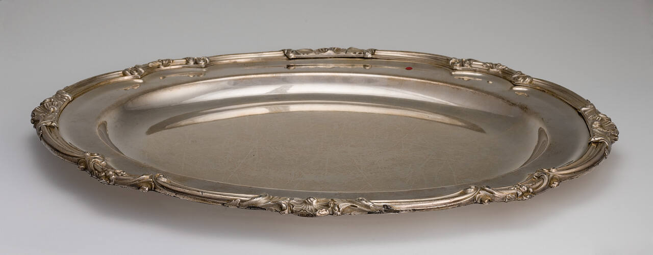 DescriptionOval in shape with shell shapes on two sides and each end connected by outwardly curved and convex small shell and leaf designs, all connected by curved and pleasing molding, descending by a plain band into an oval half round base.