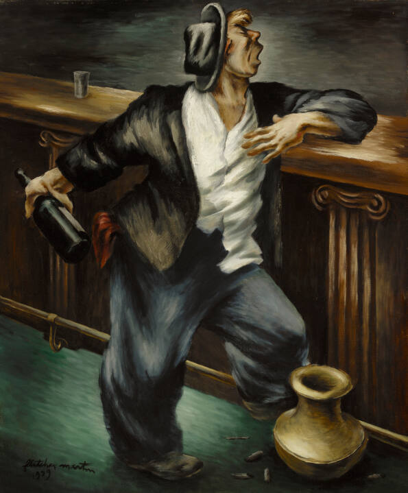 Fletcher Martin was born in Palisade, Colorado, and grew up in Idaho and Washington. His experiences as a migrant farm worker, lumberjack, sailor and boxer inspired his gritty paintings of the 1930s and 1940s that were acclaimed for their bold portrayal of a “surging, vital, often crude and lusty, America.” Celebration, with its emphasis on exaggeration and expressive gesture, typifies Martin’s best compositions. A depiction of isolated overindulgence and lost inhibition, the painting exemplifies the fusion of pathos and humor found in Martin’s art.