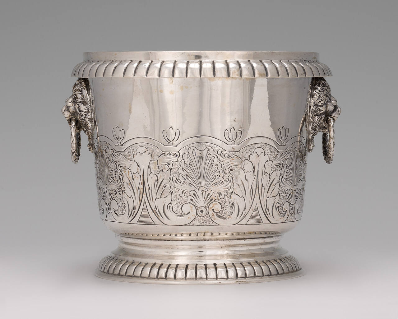 DescriptionLow vase decorated on sides with band of incised floral and shell motifs, and having impressed dentil motif around base and around top. Two lion heads on sides hold in their mouths ring handles.ProvenanceMargaret Cameron Chapman (née Mann, 1865-1935), Kansas City, MO, by 1935;