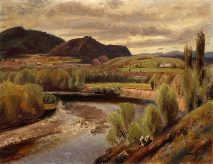 DescriptionSteep hillside with poplars, lower right center, stream extends from lower left center to bend in foreground, turning left, with steep banks bearing trees. Farm buildings, right backgound, amid rolling hills. Other buildings in clear area before two large, dark hills, left background; cloudy sky.Published ReferencesEdward Alden Jewell, “In the Realm: Three One-Man Shows;