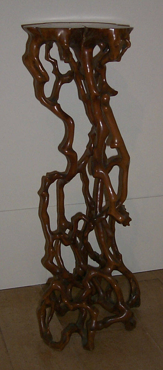 DescriptionA root wood stand, possibly made of huangyangmu, although it does not appear heave enough, with an irregularly lobed cross-sectional top supported on an intricately entwined base which twists and turns to four "feet." 18th century.
