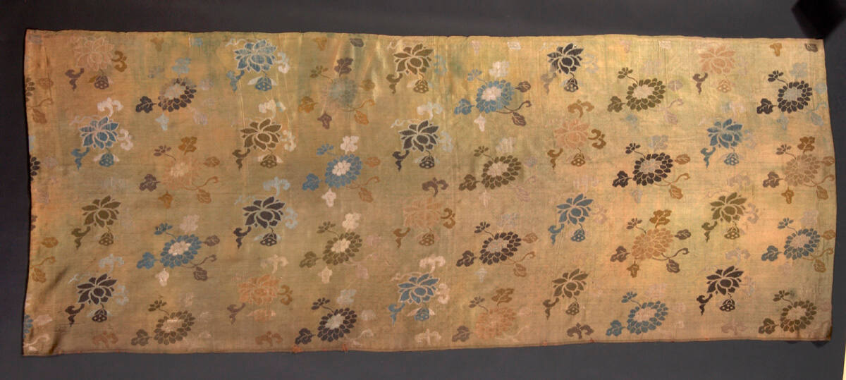 DescriptionBlue, yellow and white lotus and chrysanthemum on green ground.